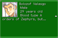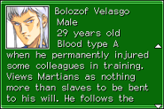 Bolozof Velasgo (ボロゾフ・ヴェラスゴー Borozofu Verasugō) is a Lieutenant of the UNSF Special Task Force Acemos and, in the 24-scene path, a converted BAHRAM soldier. He is one of the main antagonists of Zone of the Enders: The Fist of Mars.