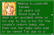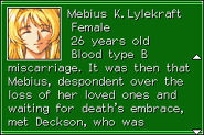 At some point in the past, Mebius moved to Mars with her husband. One day, her husband decided to go buy a toy for their unborn baby, but was killed in an accident. The accident caused her to lose her baby due to a miscarriage. Later, the suicidal Mebius would meet Deckson Geyse, who conducted research into the accident to prove that it was an Earth general's mistake, and joined BIS.[1]