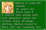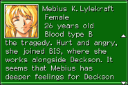 Mature beyond her years, Mebius's caring, soft, beautiful exterior hides a keen strategic mind. She has a motherly role towards the younger BIS pilots, perhaps partially due to her trauma of losing her own child. She defends Phil from Razma's antagonism, and makes comments on Razma's increasing maturity while casually brushing aside his attempts to woo her. Her eyes are often closed, but open when she is extremely angry.