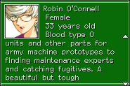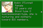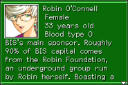 Robin O'Connell (ロビン・オコンネル Robin Okonneru) is BIS's financial supporter. She maintains many ties to the Mars Resistance's underground and operates a fund to support the Martian cause. She and her secretary, the enigmatic Twede Grey, play vital roles in BIS's exploits.